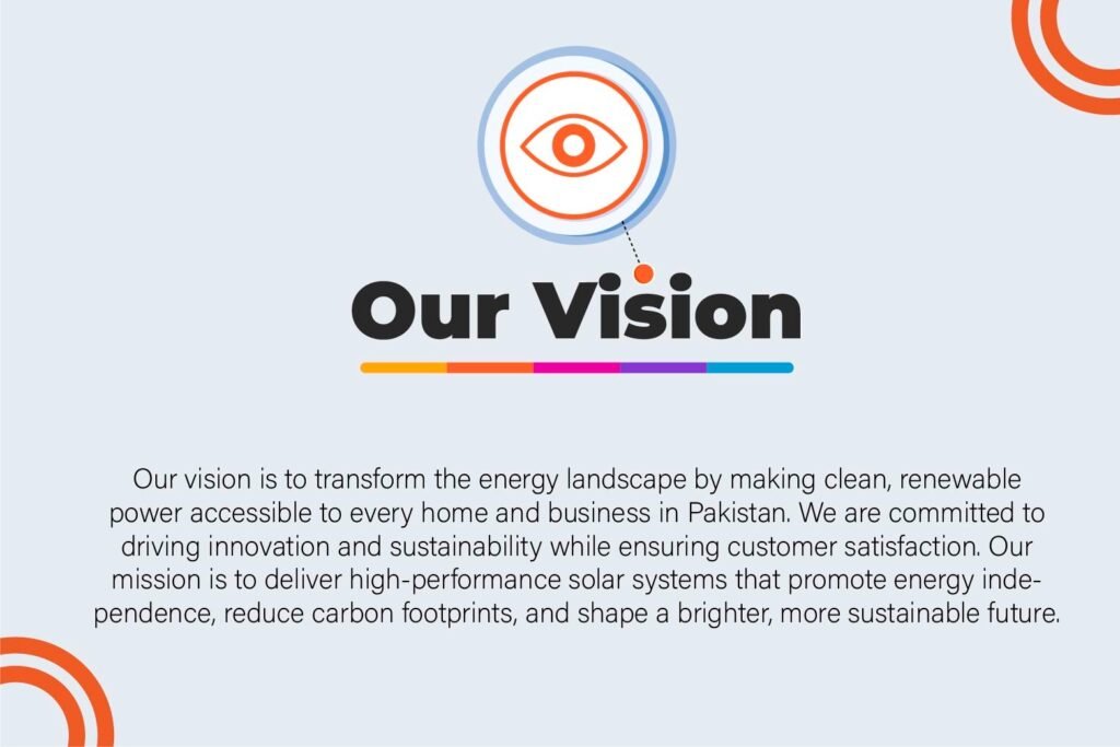 Our vision is to transform the energy landscape by making clean, renewable power accessible to every home and business in Pakistan. We are committed to driving innovation and sustainability while ensuring customer satisfaction. Our mission is to deliver high-performance solar systems that promote energy independence, reduce carbon footprints, and shape a brighter, more sustainable future.